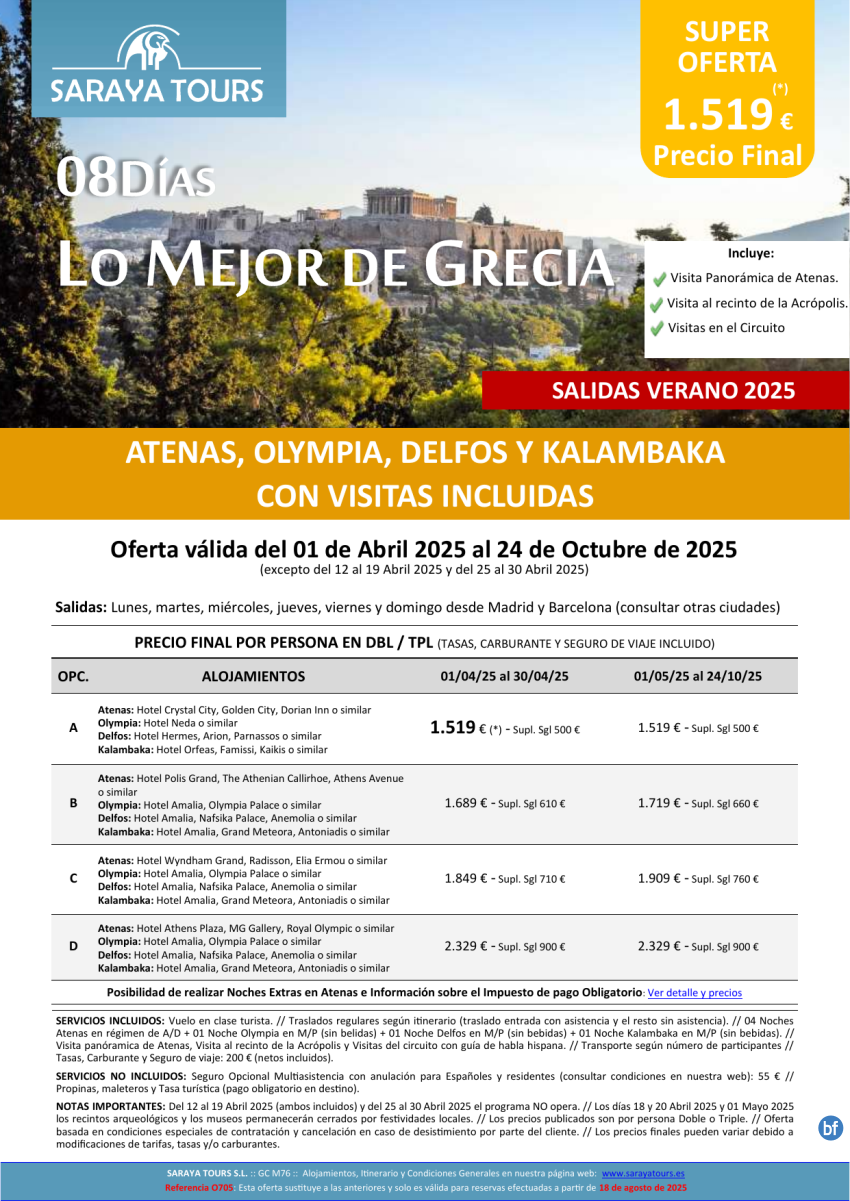 Lo Mejor de Grecia 8 días: Circuito Atenas, Olympia, Delfos, Kalambaka con Visitas Incluidas hasta Oct 25
